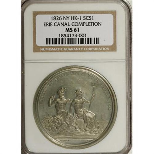 <B>1826 HK-1 Erie Canal Completion, MS61 NGC.</B></I> White metal. Issued by the Common Council, City of New York, designed by Archibald Robertson, engraved by Charles Cushing Wright, "the first die-sinker in the United States," and struck by Maltby Pedetreau. Listed in 1963 as the first so-called dollar in the standard Hibler-Kappen reference catalog, and still the standard reference today. In our recent September 2006 sale, lot 6440, an uncertified example, brought $1,955. Semiprooflike fields highlight the devices on this MS61 example. Interestingly, concentric circular die, or lathe, lines cover most of the light gray surfaces with the focus at the center of the die. Richard Snow, in his <I>Flying Eagle and Indian Head Cents,</B></I> second edition, Vol. II, 1859-1869 reference work, illustrates and discusses such lines on page 65. Fine hairlines, visible under magnification, limit the grade on this otherwise pleasing specimen.<BR><BR><b>Shipping:</b> Coins & Currency (<a target="_blank" href="http://www.heritageauctions.com/common/shipping.php">view shipping information</a>)