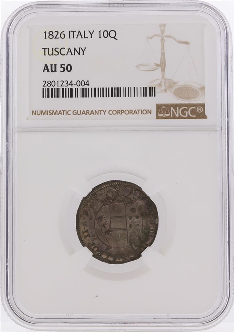 One 1826 Italy 10 Quattrini Tuscany Coin NGC AU50. NGC Certified.