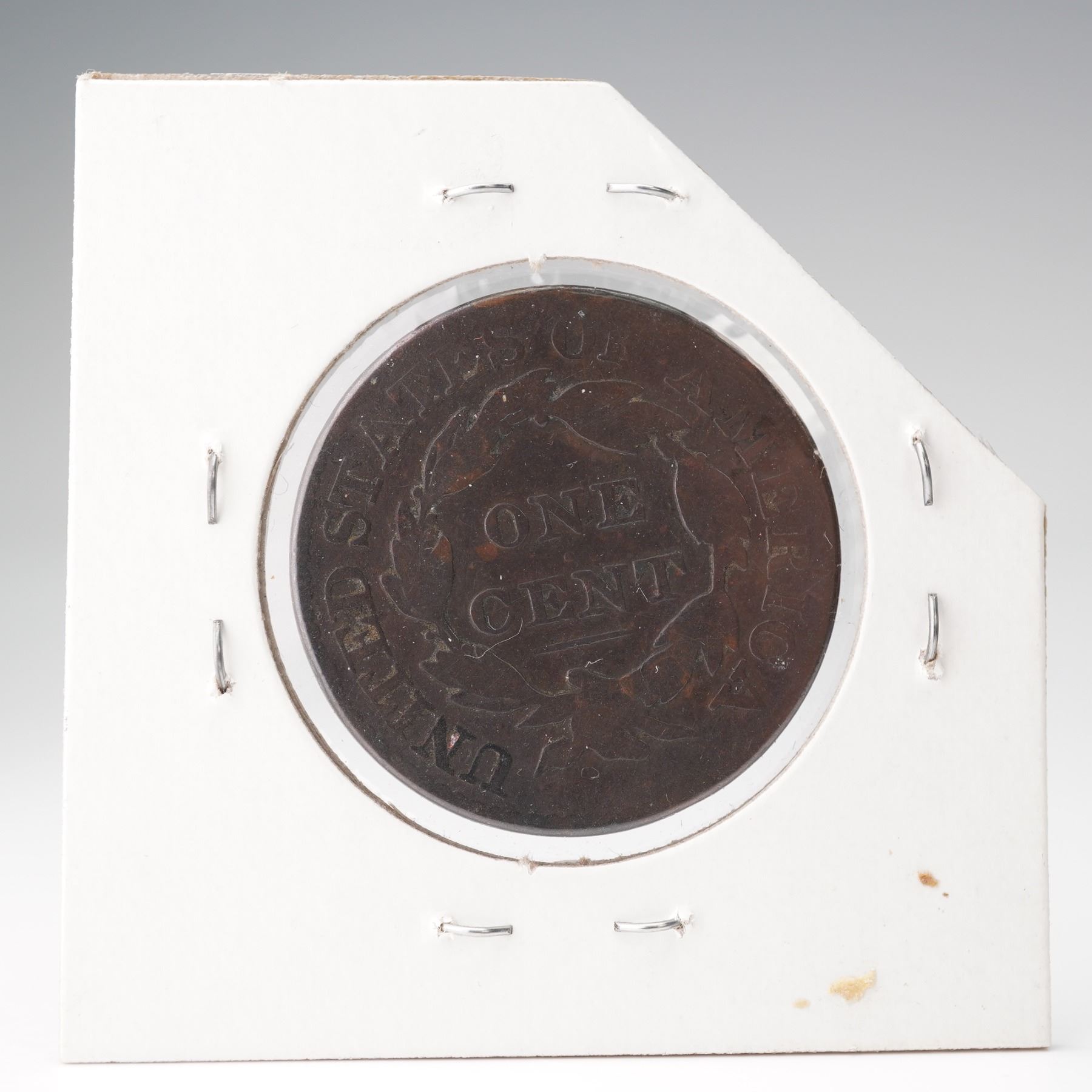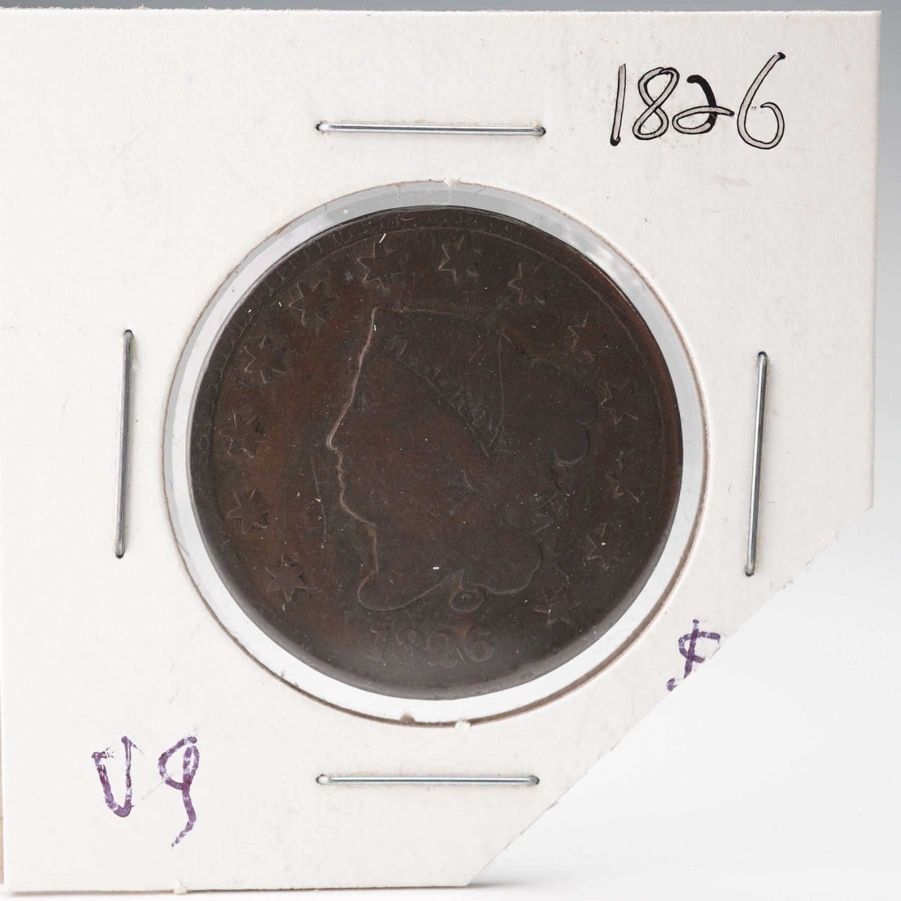 An early 19th century U.S. copper large cent featuring the Liberty Head or Matron Head design. The obverse depicts Liberty facing left, surrounded by 13 stars representing the original colonies, with the word LIBERTY inscribed on her headband and the date 1826 below. The reverse bears the denomination ONE CENT encircled by a laurel wreath, with the legend UNITED STATES OF AMERICA around the rim. Designed by Robert Scot and John Reich, this type was struck at the Philadelphia Mint from 1816 through 1839. Composed of pure copper, the coin displays the distinctive bold relief and classic engraving style characteristic of early American coinage.