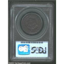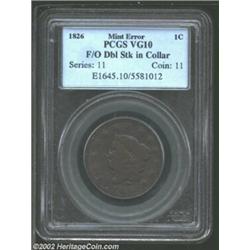 1826 MS Cent--Flip Over Double Struck in Collar--VG10 PCGS. N-5, High R.2. Rim break (as struck) above star 6 only. Dark purple-brown patina. Although this Cent is well-worn, it still displays strong evidence of a spectacular mint error. Liberty's outline and RT from her coronet are visible within the wreath. The left side of the obverse has incused stars from the initial strike, which presumably was a brockage. The curious depressions on Liberty's profile are also mint-made from the double strike. The date has faint pinscratches, and the obverse field has a few trivial contact marks. Important notice: We expect to be auctioning lots at the rate of 200-250 per hour. Sometimes eBay Premier live bid software cannot keep up with that pace, so we strongly recommend that you place a realistic proxy bid now as insurance to avoid disappointment. Also please note that all Heritage/CAA lots purchased through eBay Premier carry a 20% Buyer's Premium. Please make sure you read the Terms and Conditions.