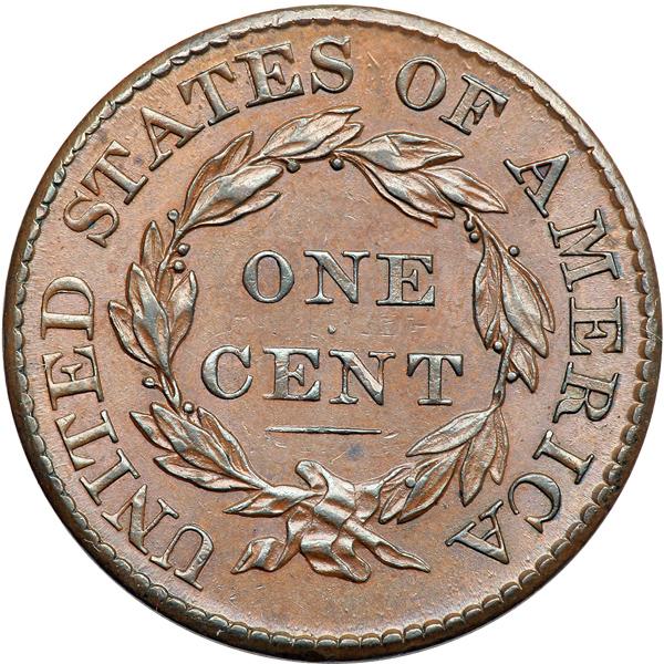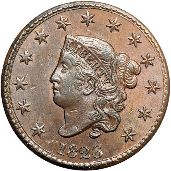 1826 N-3 R3 Wright Plate Coin. PCGS graded MS-63 Brown. A sharp mint state cent that has some minor contact marks. These include a small, light scuff in the field left of the peak of the 1 in the date, several tiny nicks in the field before the eye, and a diagonal nick on the throat. Attractive frosty light to medium brown with steel brown toning on the highpoints and satiny luster covering the fields and protected areas. Sharply struck E-MDS with microscopic die flowlines in the fields but before any crumbling in the obverse dentils. This is the Wright plate coin for the variety. Called AU55 and CC#5 in the Noyes census, his photo #25386. Bland says AU55 and CC#5 among the confirmed examples in his census. Our grade is AU50+.Pop 1; 1 in 64. Only 2 examples graded at PCGS for the variety. DWH #2598 (PCGS # 36817) .