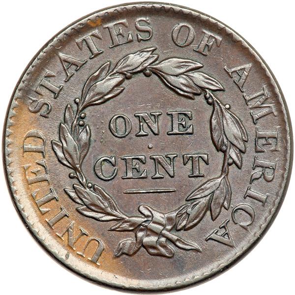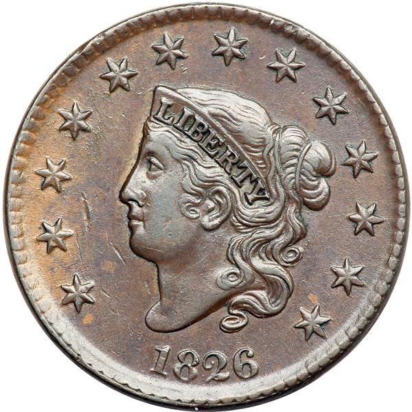 1826 N-4 R2 VF35. VF-35. Five points sharper with a rather strong vertical nick in the field between star 2 and the nose tip. Otherwise nice for the grade. Frosty chocolate brown with a swipe of tan on the left edge of each side and flowline luster in protected areas. M-LDS. The dentils are complete but weak and the reverse is rotated 15 degrees CW. DWH #0610.