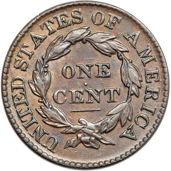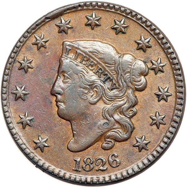 1826 N-5 R2+ VF30. VF-30. Slightly sharper with a small patch of very light verdigris in the field before the face. Otherwise free of any corrosion or verdigris and showing only a few trivial contact marks. Glossy medium brown and chocolate with lots of frosty golden light brown in protected areas. A splash of reddish brown toning covers much of the field before the portrait, and this reddish toning surrounds the small patch of verdigris already described. MDS with a rim cud break from star 5 nearly to star 7. The tiny rim cud at star 4 has not formed and the reverse is rotated 15 degrees CCW. Removed from an NCS slab graded AU details obverse corroded (NCS label included, and it shows the attribution and Reiver provenance). DWH #2916.