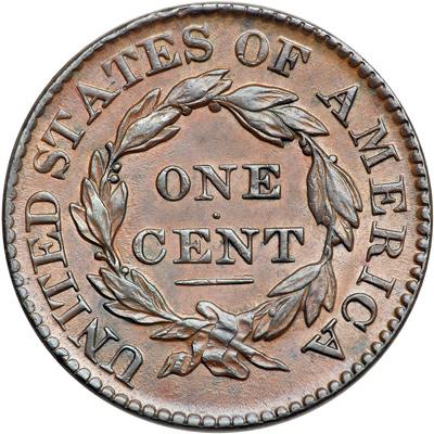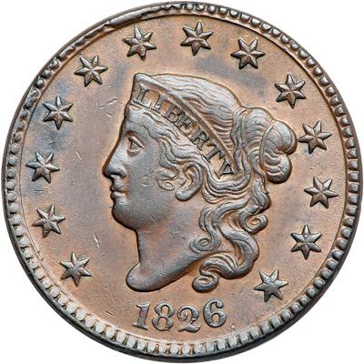 1826 N-5 R2. EF-45. Frosty medium brown with darker steel brown toning on the highpoints and a splash of dark olive toning at stars 3-4. This small splash hides a trace of microscopic roughness; otherwise this cent is close to AU50. Satiny mint luster covers the protected areas on both sides. M-LDS with small rim cud breaks from star 4 to star 7.