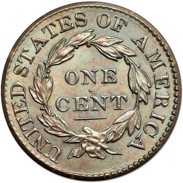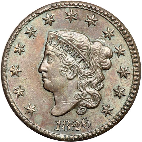 1826 N-5 R2+. PCGS graded MS-62 Brown. Frosty golden light brown with hints of sea green and light blue overtone and peeps of mint color in a couple protected areas. No spots or stains, just a few tiny ticks on the neck and throat, plus a thin diagonal nick in the field right of star 2. Sharply struck E-MDS with a rim cud break at star 6 but no crumbling in the dentils over star 5. A shallow low spot shows at the top of the inner hairbun thanks to a bit of debris on the die. Called AU55 net AU50 in the Noyes census, his photo #27775. Our grade is MS60. Pop 2; 1 in 64. DWH #3181 (PCGS # 36823) .
