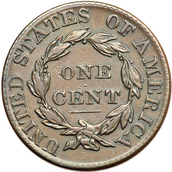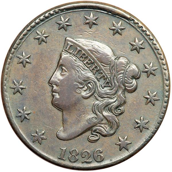 1826 N-6 R2 VF25. Triple Profile Lips and Nose Tip. Double Profile Forehead and Jaw. VF-25. Lightly cleaned and nicely retoned glossy light olive and steel brown. Smooth, mark-free surfaces except for a light nick on the left edge of the O in ONE. M-LDS with a strong rim cud break from star 6 to star 8 plus a crack along the dentil roots right of star 8 that outlines where this rim cud is about to extend to star 9. The earlier die cracks are faint but remain visible, and the reverse is rotated 20 degrees CW. There are narrow but clear double profiles on the forehead and jaw and triple outlines on the lips and nose tip. Removed from an NCS slab graded AU details improperly cleaned (NCS label included, and it shows the attribution and Reiver provenance). DWH #2918.