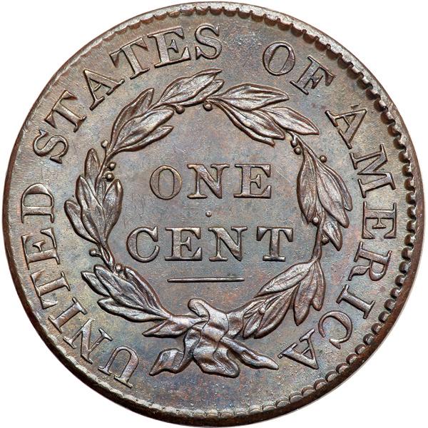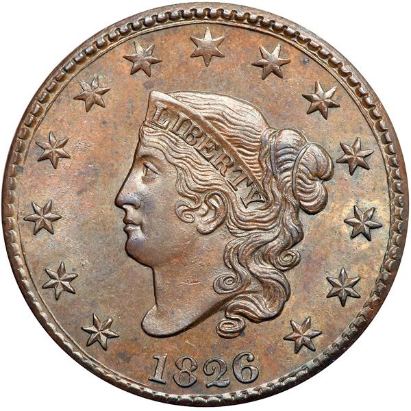 1826 N-6 R2. PCGS graded MS-64 Brown. The obverse is lustrous medium brown with delicate speckles of steel brown and the reverse is a lustrous bluish steel brown and chocolate. The only marks are a small spot of reddish chocolate toning on the nostril and a tiny speck of planchet slag in the field near the dentil right of star 8, as struck. Sharply struck E-MDS with tiny lumps of fine die rust in the obverse fields, including a collection of these tiny lumps right of star 4, and those fields are slightly reflective thanks to a die lapping used to minimize the rust. The fields are just starting to show microscopic radial flowlines near the dentil tips but the dies remain uncracked and void of rim cuds. Excellent eye appeal. Our grade is MS60. Pop 3; 2 in 66. DWH #2512 (PCGS # 36826) .