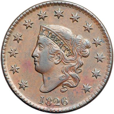 1826 N-7 R1. VF-35. Frosty medium brown with darker steel brown toning on the highpoints and faint splashes of reddish brown toning on both sides. A small planchet flake over the M in AMERICA is the only notable mark. LDS. The die clashmarks usually found inside the wreath are gone.