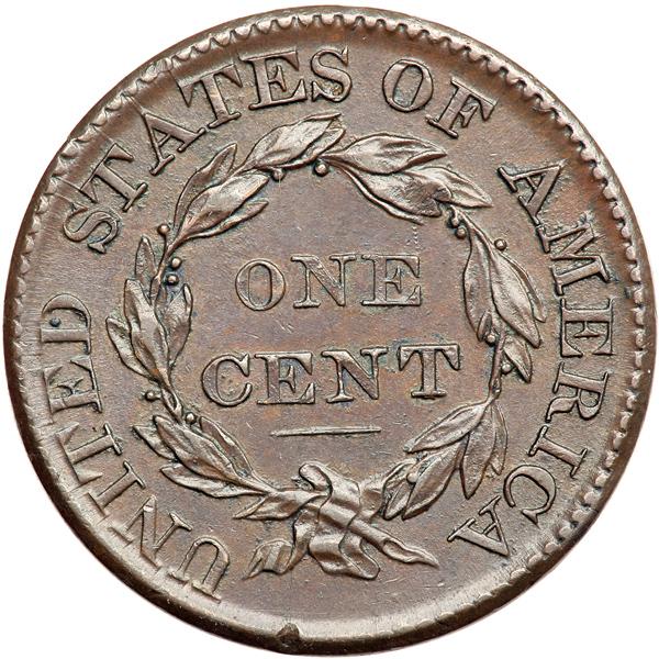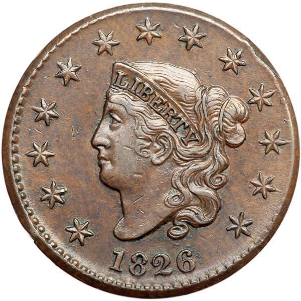 1826 N-9 R3 VF25. VF-25. Sharpness EF40 or better with smoothed rim bruises at star 2 and star 9. A dull rim nick under the ribbon tip is the only other notable mark. Attractive glossy steel brown and chocolate, the obverse delicately mottled with darker olive brown. M-LDS with a faint hairline crack from the bust tip to the dentils under star 1 and a slightly stronger fine die crack from the leaves under O in OF down through the ribbon to the dentils below. The tiny rim cud just right of star 7 has not formed. DWH #0626.