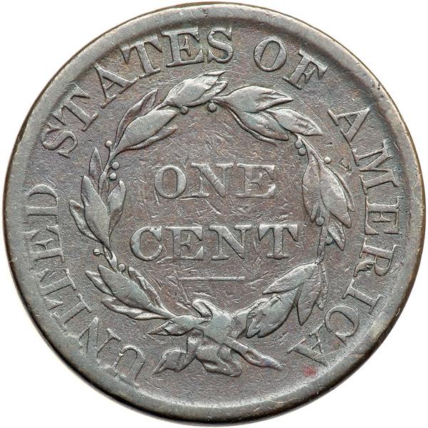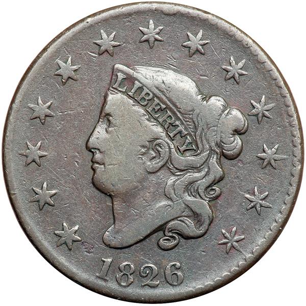 1826 N-9 R3 VG10. VG-10. Rather glossy steel brown and chocolate. A patch of microscopic roughness connects stars 11 & 12. Otherwise nice for the grade. LDS with a tiny cud break extending down into the field just right of star 7. The date is strongly doubled, a result of die chatter (bounce). DWH #1747.
