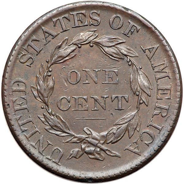 1826 N-9 R3. VF-35. Sharpness EF40 but there is a light rim bruise at the F in OF and a few dull rim nicks at the bottom of the reverse. Frosty chocolate and steel brown mixed with vertical streaks of darker olive brown toning on the right side of the obverse. Rare M-LDS with a partial cud break hanging down from the dentils just right of star 7. A clear die crack outlines where the small cud is about to occur.