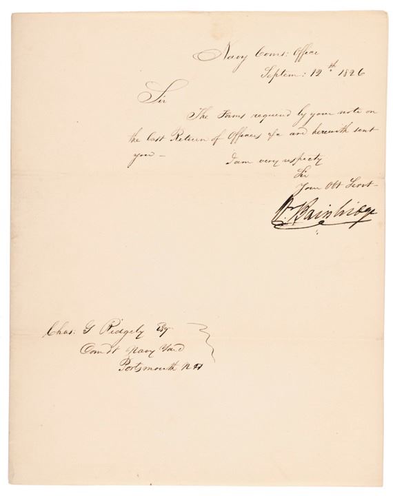September 12, 1826-Dated, Letter Signed, "Wm Bainbridge", one page, measuring 10” x 7.75”, Navy Commissioners Office. To Charles G. Ridgely, Commandant of the Navy Yard at Portsmouth, N.H. enclosing the last return of officers (not present). Bold impressive signature. Choice Very Fine.