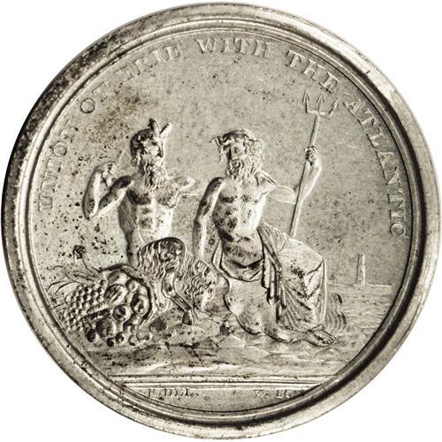 <B>1826 So-Called Dollar, HK-1, Erie Canal Completion, Uncirculated Uncertified.</B></I> White metal. About 90% of the original silvering is still on the medal. Issued by the Common Council, City of New York; designed by Archibald Robertson; engraved by Charles Cushing Wright, "the first die-sinker in the United States"; and struck by Maltby Pedetreau. Listed in 1963 as the first so-called dollar in the standard Hibler-Kappen reference catalog, and still the standard reference today. This outstanding Uncirculated example in white metal is listed as "extremely rare."