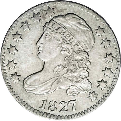 <B>1827<10C> JR-13, R.3. Reiver state a--Improperly Cleaned--NCS. AU Details..</B></I> A well struck coin that boasts strong details on Liberty's curls and the eagle, although the obverse stars lack their central radial lines. Minor rim crumbling from Liberty's cap to star eleven as frequently seen on this die pairing. The color is a dull silver to gray color throughout with a few hints of chemical iridescence near the devices. Trivial hairlines are seen on the reverse, but the surfaces are very clean overall.<BR><I>Ex: Eric Gutscher (August 1986).</B></I> Envelope Included.