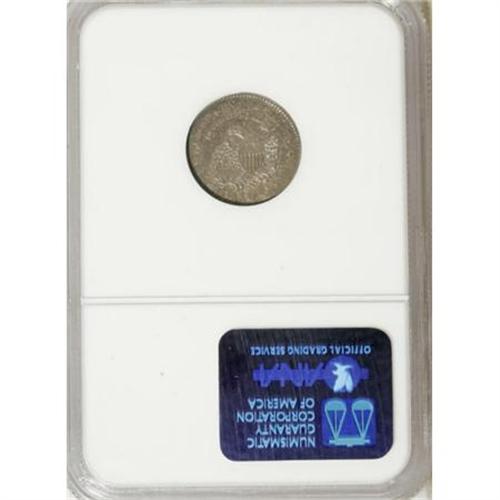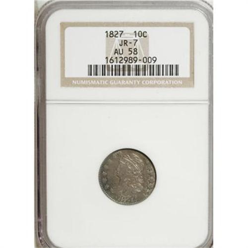 <B>1827 10C AU58 NGC.</B></I> JR-7, R.3. Digit 7 is more than half under the curl, and the base of A in AMERICA is below the M on this variety. Cobalt-blue and lilac-gold toning rides over the surfaces of both sides, each of which depicts noticeable field-motif contrast when the coin is tilted slightly under a light source. A couple of light circulation marks do not detract.<BR><BR><B>Coin Engraver:</B> John Reich<BR><BR><b>Shipping:</b> Coins & Currency (<a target="_blank" href="http://www.heritageauctions.com/common/shipping.php">view shipping information</a>)