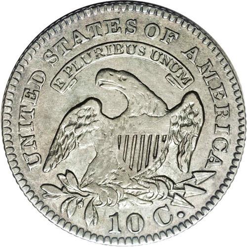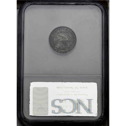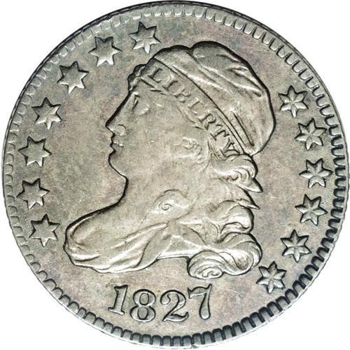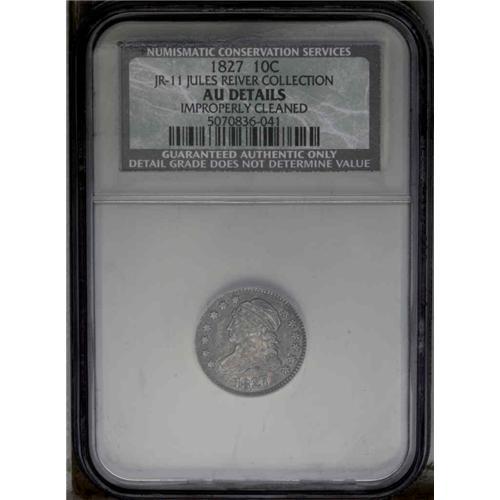 <B>1827<10C> JR-11, R.2. Reiver state a.--Improperly Cleaned--NCS. AU Details.</B></I> Darkly toned with mottled gray, blue and brown, and not very attractive. The surfaces are clean for the grade, but the strike is lacking the finer definition on the left obverse stars, some of Liberty's curls and the eagle. Strike doubling is seen on the reverse on the peripheral devices and lettering.<BR><I>Ex: Cizik (August 1982).</B></I> Envelope Included.