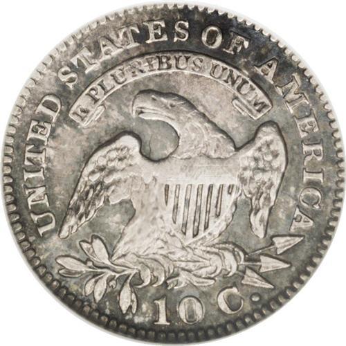 <B>1827<10C> MS62 NGC.</B></I> JR-11, R.2. Deep dove-gray and forest-green toning envelops this undisturbed Capped Bust dime. Refreshingly free from marks, and satin luster emerges when the piece is rotated beneath a light. Somewhat soft in the centers, as made.