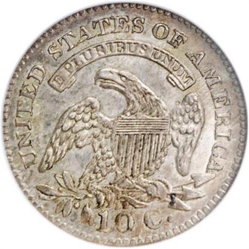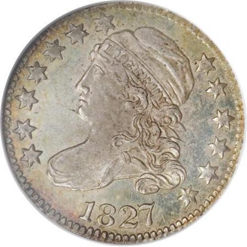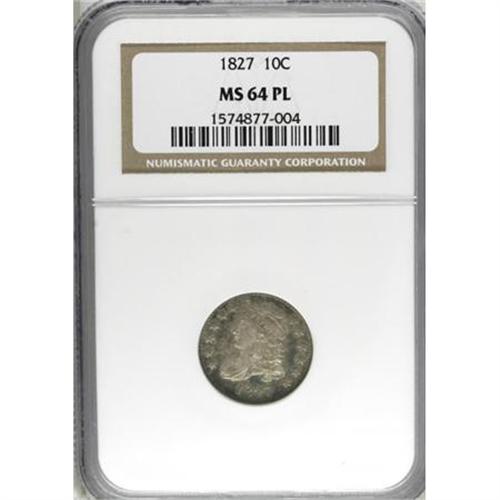 <B>1827 10C MS64 Prooflike NGC.</B></I> JR-13, R.3. Digit 7 entirely under the curl, star 7 points to upper edge of the head and, and the CA of AMERICA is joined. Delicate iridescent multicolored patina in the fields does not impede their prooflike characteristics, and the contrast they present with the mildly frosted motifs. Well struck, except for characteristic flatness in the star centers. A few minor obverse handling marks preclude full Gem classification. Census: 1 in 64 Prooflike, 0 finer (7/07).<BR><BR><B>Coin Engraver:</B> John Reich<BR><BR><b>Shipping:</b> Coins & Currency (<a target="_blank" href="http://www.heritageauctions.com/common/shipping.php">view shipping information</a>\)