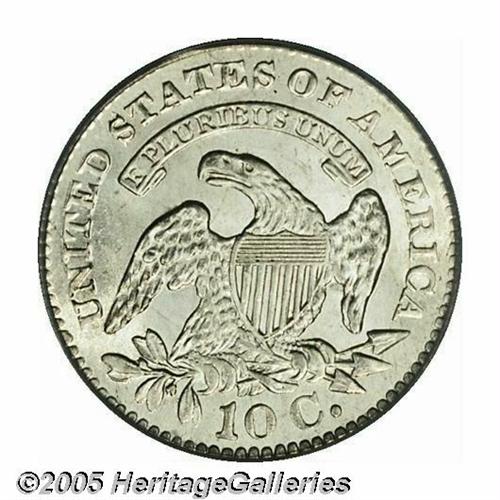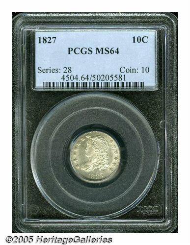 <B>1827<10C> MS64 PCGS.</B></I> JR-4, R-2. Of this variety, the authors of <I>Early United States Dimes: 1796-1837</B></I> state: "High grade pieces above XF45 are obtainable with patience." Each side exhibits a satiny, completely untoned appearance. The central portraits show noteworthy definition for the series and neither the obverse nor the reverse reveal any distracting abrasions. Some degree of typical flatness is seen on many of the obverse stars. An important opportunity for collectors who specialize in this interesting series.