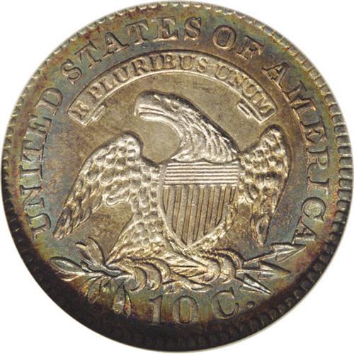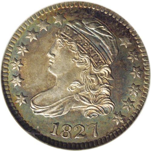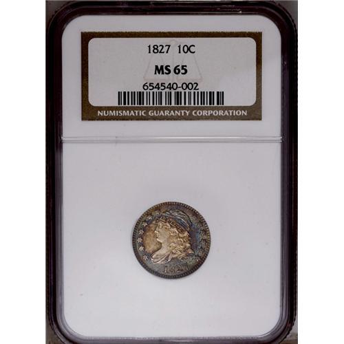 <B>1827<10C> MS65 NGC.</B></I> JR-12, R.1. Pleasing ocean-blue and honey-gold bands frame untoned centers. This satiny Gem has remarkably smooth surfaces. Well struck except for the eagle's claws and stars 6 and 7. Worthy of a high quality early silver type set. Census: 22 in 65, 7 finer (4/06).