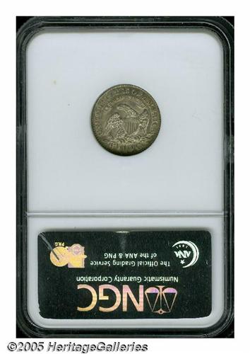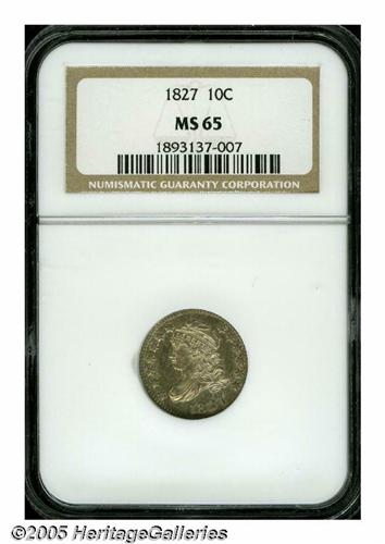 <B>1827<10C> MS65 NGC.</B></I> JR-12, R1. One of the more common of thirteen die pairings for this issue, easily recognized by the low placement of the 7 in the date and the final A in AMERICA being solidly attached to the arrow. This frosty, semi-reflective example is lightly toned in streaky golden-gray hues and displays only a few wispy blemishes on the obverse. Outstanding quality in a large size Capped Bust Dime. Population: 20 in 65, 5 finer (4/05).