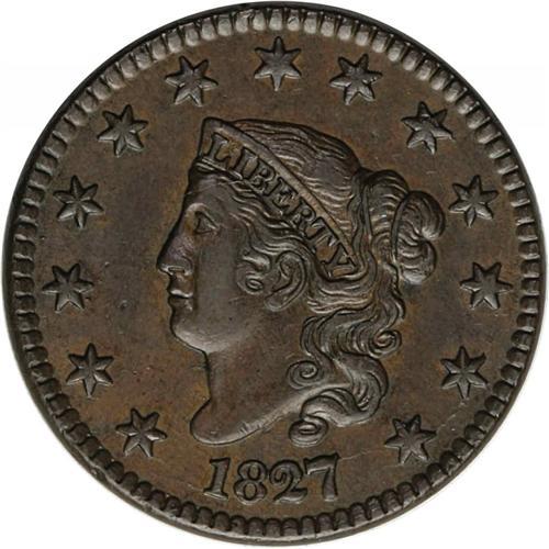 <B>1827<1C> N-6, R.3. AU58 NGC. XF40 EAC.</B></I> Late Die State. A light crack encircles all stars, and another grows from the center of 82 in the date to the top of the 7 to the inner point of star 13. Semi-glossy medium brown surfaces exhibit sharply impressed motifs that are well centered on the planchet. The obverse dentilation is bold; that on the reverse all shows, but is not as bold as on the obverse. The surfaces are refreshingly clean, revealing just a few unobtrusive obverse marks.<BR><I>Ex: Del Bland (7/19/1969).</B></I> Envelope Included.
