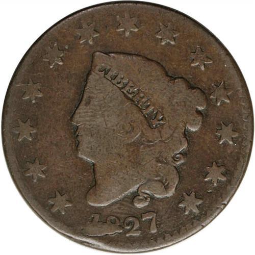 <B>1827<1C> N-8, R.3. Good 6 NGC and EAC.</B></I> Terminal Die State. A rare die state with a small piece of the die missing from the interior of the obverse die obliterating the bottom half of 18 in the date. Chestnut-brown surfaces reveal a few miniscule marks scattered over the fields, none of which are serious. The devices display nice detail for the grade.<BR><I>Ex: John Nicholas (5/7/1983).</B></I> Envelope Included.