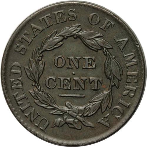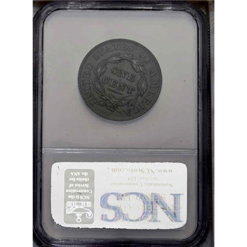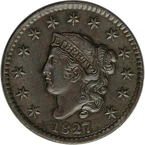 <B>1827<1C> N-11, R.1--Improperly Cleaned--NCS. AU Details. XF40 EAC.</B></I> A wide date example identified by crude recutting on the base of the T in CENT. The olive-brown color is unnatural for a circulated large cent, but subsequent retoning has made the patina more acceptable. This briefly circulated piece shows only slight wear on the cheek and forehead, and the surfaces are free from distracting marks.<BR><I>Ex: George Ramont (2/1966).</B></I> Envelope Included.
