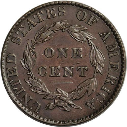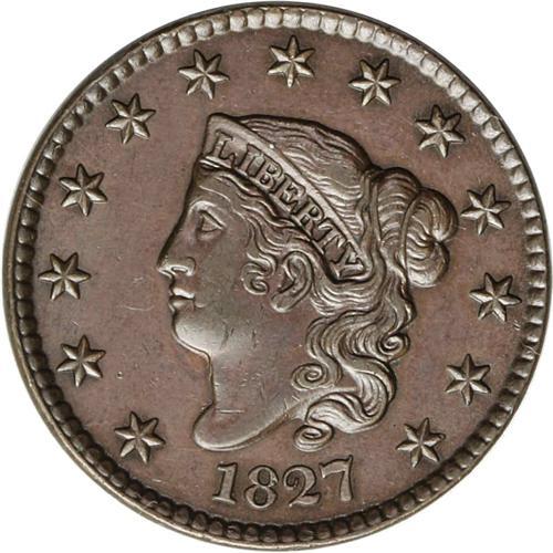 <B>1827<1C> N-2, R.3--Improperly Cleaned--NCS. AU Details. XF45 EAC.</B></I> Usual Die State. Like all known examples, this coin has the lower reverse dentils merged together, from 5 o'clock to 7 o'clock. Medium tan patination displays subtle orange undertones. The design elements are boldly defined and nicely centered, and all of the dentilation is strong. Semi-glossy surfaces reveal some wispy hairlines, but are devoid of mentionable contact marks, though a minute abrasion below the E of CENT can serve to identify the piece. A very appealing coin, despite being lightly cleaned.<BR><I>Ex: Levine (8/12/1971).</B></I> Envelope Included.