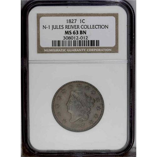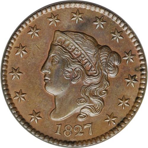 1827 1C MS63 Brown NGC. N-1, Early Die State, High R.2 1827[1C] N-1, High R.2. MS63 Brown NGC. AU55