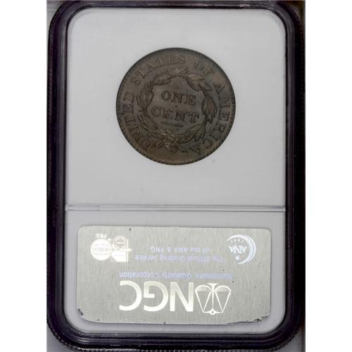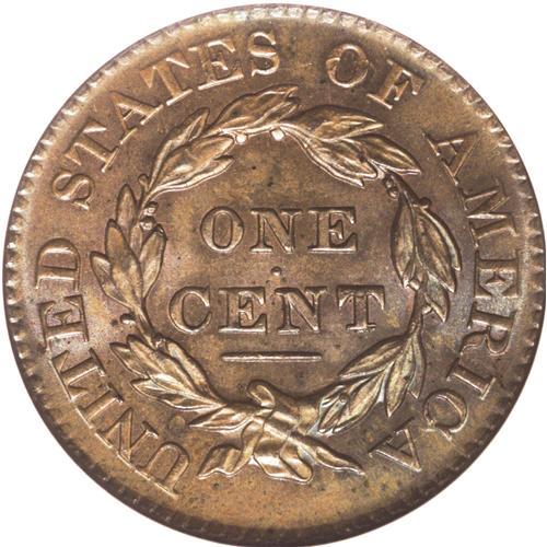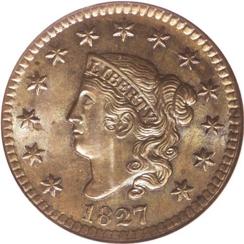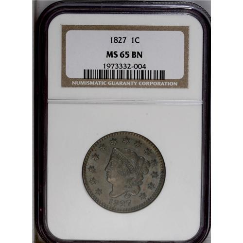 <B>1827<1C> MS65 Brown NGC.</B></I> N-11, R.1. This Wide Date variety has ER in LIBERTY touching at their bottoms and nearly at their tops, and shows recutting on the base of the T in CENT. A minute center dot is on the front of the ear. The lovely Gem piece has a smooth, medium brown planchet with no mentionable distractions other than a tiny spot of dark toning near star 3. EAC 60.
