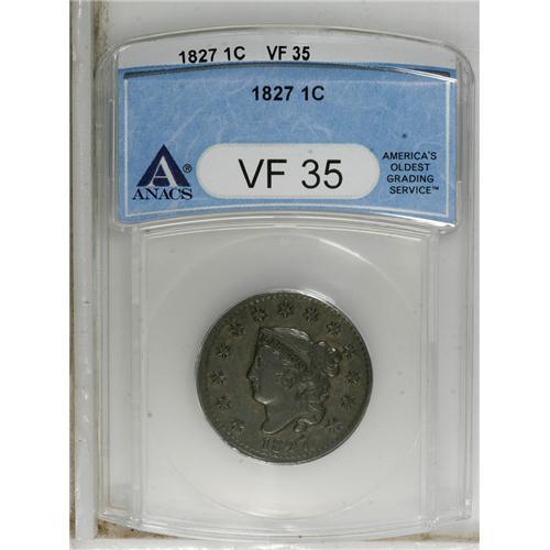 <B>1827 1C VF35 ANACS.</B></I> NGC Census: (7/101). PCGS Population (4/0). Mintage: 2,357,732. Numismedia Wsl. Price for NGC/PCGS coin in VF35: $147. (#1651)<BR><BR><b>Shipping:</b> Coins & Currency (<a target="_blank" href="http://www.heritageauctions.com/common/shipping.php">view shipping information</a>)