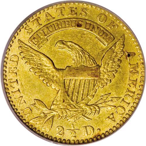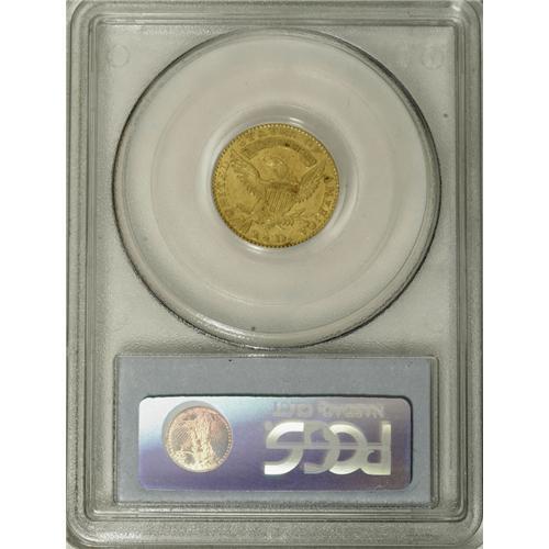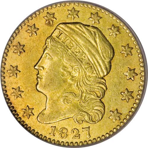 <B>1827 $2 1/2 AU55 PCGS.</B></I> Breen-6131, BD-1, R.5. This is the only known variety of 1827 quarter eagles and it is doubtful that any others will be found as the mintage was limited to a mere 2,800 coins according to the <I>Guide Book.</B></I> In the new reference on the series by John Dannreuther, <I>Early U.S. Gold Coin Varieties,</B></I> the actual mintage is estimated in the range of 1,750 to 2,800 coins.<BR> There was actually only one quarter eagle die produced for this coinage, as the reverse was carried over from its earlier use for both some 1825 quarter eagles and all 1826 pieces. This example appears to be an early die state before the reverse die was lapped, as traces of clash marks appear at the left end of the scroll, nearly identical to late states of the 1826 quarter eagles. This Choice AU piece has attractive greenish-gold surfaces with considerable luster. Both sides are lightly abraded, typical in appearance to nearly all known examples of the design type that was issued from 1821 to 1827.<BR><I>From The Temecula Collection, Part Two.</B></I><BR><BR><b>Shipping:</b> Coins & Currency (<a target="_blank" href="http://www.heritageauctions.com/common/shipping.php">view shipping information</a>)