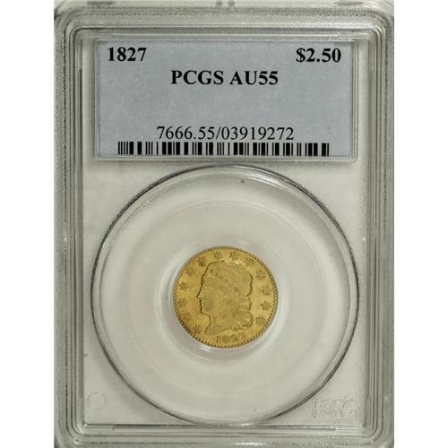 1827 $2 1/2 AU55 PCGS. Breen-6131, BD-1, R.5. This is