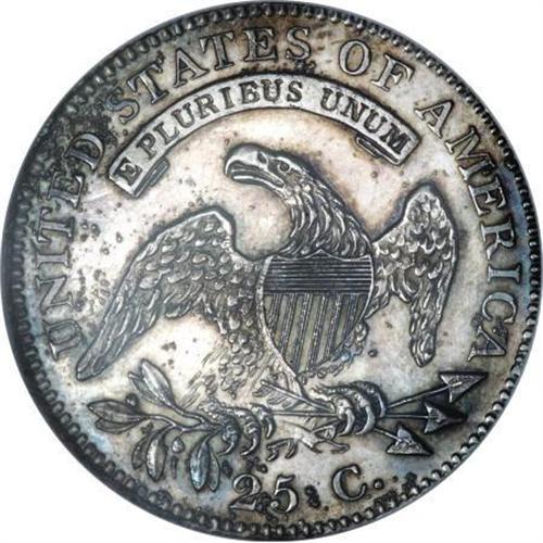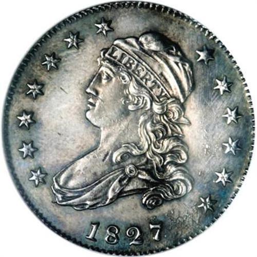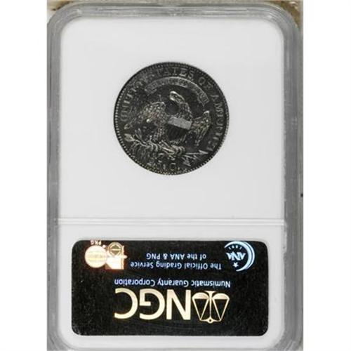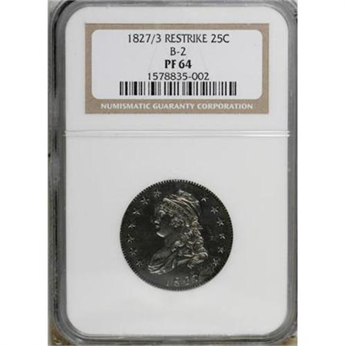 <B>1827/3 25C Restrike PR64 NGC.</B></I> B-2, High R.6. Although Mint records indicate that 4,000 Capped Bust quarters were produced in 1827, Breen (1988) speculates that this mintage may have been comprised of coins dated 1825. Only 12 originals (again, per Breen) are believed extant, all of which were struck as proofs. During the late 1850s, Mint employees mated the old 1827-dated obverse die with an old, rusted reverse die from the 1819 delivery. At least 12 restrikes were produced in two batches, the latter examples showing extensive die rust on the obverse.<BR> With readily evident die rust (as struck) on the obverse (particularly to the right of the date) and throughout the reverse, the present near-Gem is probably one of the later restrikes of this fabled Bust quarter. This is a sharply impressed coin except on the obverse stars where the dentils are slightly soft. A few of the more minor details over the lower part of the eagle have been effaced by polishing--an accepted part of the production process. The surfaces are noticeably hairlined on each side, but there is ample reflectivity evident beneath the rich endowment of charcoal toning that envelops both sides, as are traces of electric-blue undertones at the margins and a slight accent of reddish patina. The only useful pedigree markers are a tiny diagonal contact mark in the left obverse field inside star 2 and an oblong planchet flaw on the neck of Liberty. Census: 4 in 64, 4 finer (12/07).<BR><I>Ex: October Long Beach Auction (Heritage, 10/2001), lot 6287.</B></I><BR><BR><B>Coin Engraver:</B> John Reich<BR><BR><b>Shipping:</b> Coins & Currency (<a target="_blank" href="http://www.heritageauctions.com/common/shipping.php">view shipping information</a>)