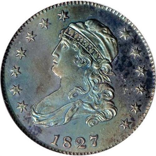1827/3 25C Restrike PR65 NGC. B-2. Incorrect and misleading Information regarding the celebrated 1827/3 quarter has been disseminated to collectors throughout the past century. Even the most rudimentary of specifications such as the mintage of the 1827/3 Original pieces is incorrect. For years it has been repeatedly published that 4,000 quarters were struck bearing the date of 1827. Bust quarter specialist and researcher Karl Moulton has recently offered an in-depth study on this issue to the numismatic community. Among many facts he extracted from years of researching documents in the National Archives is that the 4,000 figure that is suggested as the mintage of 1827 quarters actually represents the first delivery of 1828 B-1 quarters. In stark contrast to the previously accepted mintage of 1827/3 quarters, Moulton concludes in his dissertation on the subject that only "eight or nine" Originals were struck in 1827.<BR> Contemporary documentation unearthed by Moulton helped to unravel the mystery of the 1827/3 quarters to some degree, although it should be known that his research should still be considered theory rather than absolute fact. Extensive examination of auction records and official Mint documentation formed the basis of his conclusion that there were five emissions of 1827/3 quarters:<BR><BR> <I> 1) Two Essay pieces, struck over draped bust quarters using a close collar press in 1827.<BR> 2) Eight or nine silver Originals that were created in an open collar press in 1827.<BR> 3) Nine or 10 silver Restrikes made from rusted dies in an open collar configuration in 1876.<BR> 4) Copper Restrikes, struck one year later with the same dies as the third emission. Four or five coins produced.<BR></B></I> <I> 5) Another batch of silver strikes using rusted dies in an open collar, this time damaged on the obverse. Five or six pieces struck during the 1877 to 1878 timeframe.<BR></B></I><BR> The damage to the obverse die that Moulton refers to in his research is simply a light die crack from the juncture of the neck and throat and into the left obverse field. He speculates that this damage occurred after the copper Restrikes were made. If Moulton's reasoning is correct, then the current example offered in this lot is a fifth emission Restrike, thus qualifying it as being technically rarer than the Originals from the second emission. Regardless of the emission sequence, any 1827/3 quarter is a legendary coin that few numismatists will ever have the privilege of owning. The current example has the added distinction of being one of the finest pieces known, although the proof designation given by the grading services is the subject of yet another debate regarding this issue. Technically speaking, the 1827/3 quarters, both Originals and Restrikes, are simply prooflike strikes produced from freshly lapped dies. However, in terms of surface quality, the 1827/3 quarter offered here is a true Gem regardless of strike classification. This brilliantly lustrous piece exhibits beautiful aquamarine toning with slightly deeper cobalt-blue centers and mint-green coloration at the peripheries of both sides. A touch of smoke-gray toning is observed in the right obverse fields above and behind Liberty's head. Census: 3 in 65, 1 finer (8/07). <BR><BR><BR><B>Coin Engraver:</B> John Reich<BR><BR><b>Shipping:</b> Coins & Currency (<a target="_blank" href="http://www.heritageauctions.com/common/shipping.php">view shipping information</a>)