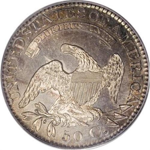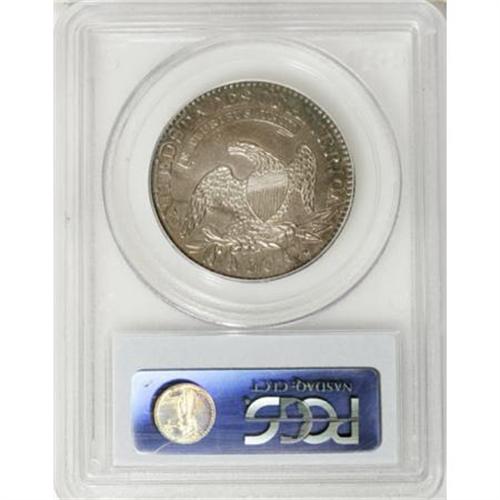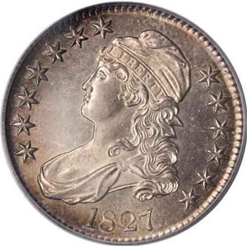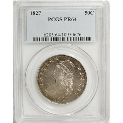 <B>1827 50C PR64 PCGS.</B></I> <B>Breen Plate Coin.</B></I> O-107, R.7, as a proof. Since 1990, we have a record of only eight appearances of the 1827 half in public auctions. This probably represents no more than five or six individual coins, which makes Breen's statement from 1977 an accurate assessment of rarity: "at least four different specimens exist, possibly as many as seven." Of the five pieces listed in Stephen Herrman's list of auction appearances, all are of the O-121 variety. This piece is unlisted on his roster. From Breen's notes from his book 30 years ago, this is the only proof known from this die pairing, and that still seems to be the case today. <BR> Identifiable as the plate coin by a slightly angling toning streak on the left side of the reverse. The central devices show razor-sharp definition, while the peripheral stars are slightly weak in the centers (a normal occurrence for proofs struck on a screw press). The fields are deeply reflective on each side, and both obverse and reverse are well-matched in terms of visual appeal, toning, and preservation of surfaces. Lightly toned around the margins on each side, with slightly deeper golden and blue color on the reverse. These tonal qualities surround centers that are essentially brilliant. <BR> Proofs of any denomination from this era are of the greatest rarity and importance. This particular coin represents a singular opportunity to acquire the only O-107 proof striking from this year. As such, it is an opportunity not to be missed.<BR><BR><B>Coin Engraver:</B> John Reich<BR><BR><b>Shipping:</b> Coins & Currency (<a target="_blank" href="http://www.heritageauctions.com/common/shipping.php">view shipping information</a>\)