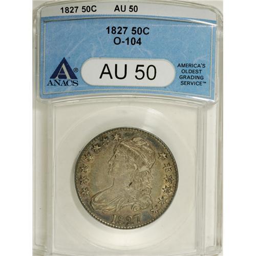 <B>1827 50C Square Base 2 AU50 ANACS.</B></I> O-104. NGC Census: (186/1784). PCGS Population (98/740). Mintage: 5,493,400. Numismedia Wsl. Price for NGC/PCGS coin in AU50: $221. (#6144)<BR><BR><b>Shipping:</b> Coins & Currency (<a target="_blank" href="http://www.heritageauctions.com/common/shipping.php">view shipping information</a>)