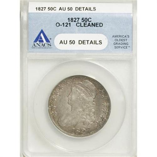<B>1827 50C Square Base 2--Cleaned--ANACS. AU50 Details.</B></I> O-121. NGC Census: (93/907). PCGS Population (101/769). Mintage: 5,493,400. Numismedia Wsl. Price for NGC/PCGS coin in AU50: $221. (#6144)<BR><BR><B>Coin Engraver:</B> John Reich<BR><BR><b>Shipping:</b> Coins & Currency (<a target="_blank" href="http://www.heritageauctions.com/common/shipping.php">view shipping information</a>)