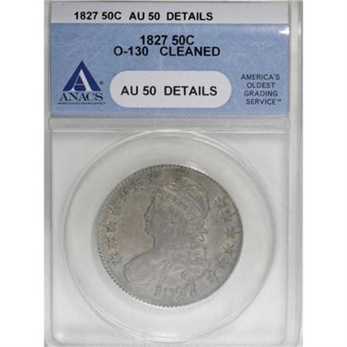 <B>1827 50C Square Base 2--Cleaned--ANACS. AU50 Details.</B></I> O-130, R.3. A lightly hairlined but exceptionally detailed cream-gray example. A minor reeding mark on the eagle's beak is barely worthy of mention. There are 49 known die marriages of 1827 halves, enough to keep any collector busy for years.<BR><BR><B>Coin Engraver:</B> John Reich<BR><BR><b>Shipping:</b> Coins & Currency (<a target="_blank" href="http://www.heritageauctions.com/common/shipping.php">view shipping information</a>)