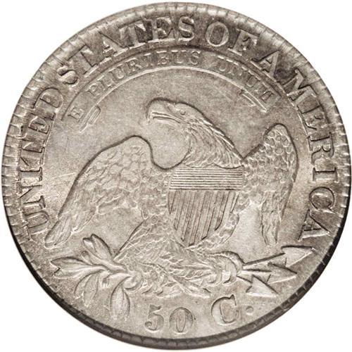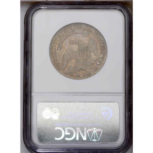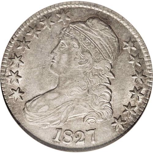 <B>1827<50C> Square Base 2 AU50 NGC.</B></I> O-115, R.2. Attributed by a vertical die defect in the 2 of the date, and by mostly flat vertical stripes on the reverse shield. A bold striking with satiny surfaces that exhibit steel-gray toning, complemented by strong apricot-gold luster in the protected areas. Typically worn, for the grade, with a few minor surface marks.<BR><I>Ex: FUN (1/3/1984).</B></I> Envelope Included.