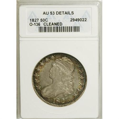 <B>1827 50C Square Base 2--Cleaned--ANACS. AU53 Details.</B></I> O-136. NGC Census: (94/807). PCGS Population (81/663). Mintage: 5,493,400. Numismedia Wsl. Price for NGC/PCGS coin in AU53: $233. (#6144)<BR><BR><B>Coin Engraver:</B> John Reich<BR><BR><b>Shipping:</b> Coins & Currency (<a target="_blank" href="http://www.heritageauctions.com/common/shipping.php">view shipping information</a>)