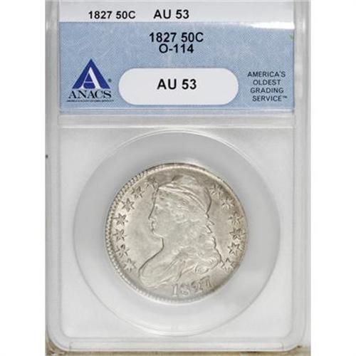<B>1827 50C Square Base 2 AU53 ANACS.</B></I> O-114. NGC Census: (98/1043). PCGS Population (90/681). Mintage: 5,493,400. Numismedia Wsl. Price for NGC/PCGS coin in AU53: $233. (#6144)<BR><BR><B>Coin Engraver:</B> John Reich<BR><BR><b>Shipping:</b> Coins & Currency (<a target="_blank" href="http://www.heritageauctions.com/common/shipping.php">view shipping information</a>)