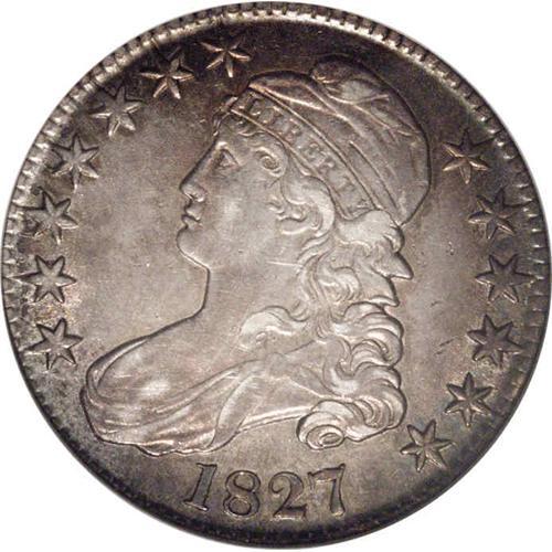 <B>1827<50C> Square Base 2 AU53 NGC.</B></I> O-111, R.4. Dusky rose toning dominates this unusual but appealing coin, in which the worn highpoint areas are light blue. The attribution of this scarce variety is confirmed both by Overton, who says, "Line one of stripes one, two, and three [extends] to crossbar two," and by Peterson <I>(The Ultimate Guide To Attributing Bust Half Dollars),</B></I> who says, "Gule three has an extension of the first and third pale beneath the base of the shield with an open area appearing like a key hole." The strike is generous, from moderately eroded dies. An area of dark toning or carbon is noted with a glass between STATES and OF, but it fails to diminish the beauty of this lovely specimen.<BR><I>Ex: Don Frederick (1/30/1980).</B></I> Envelope Included.
