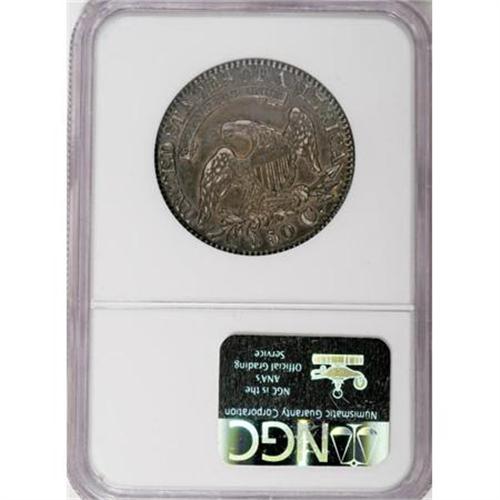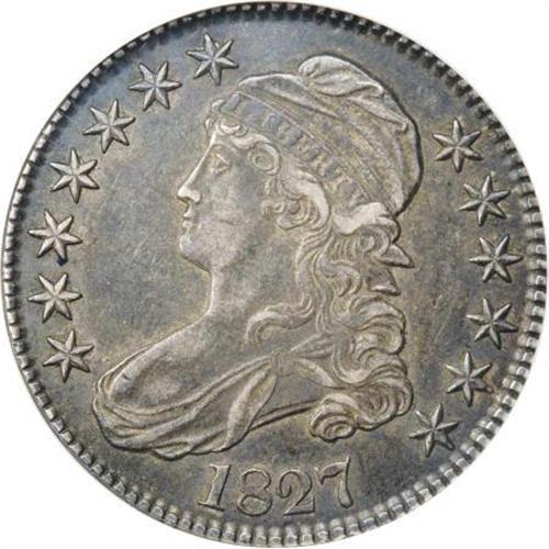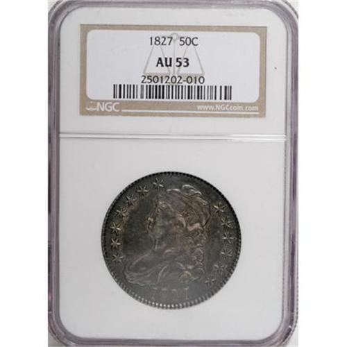 <B>1827 50C Square Base 2 AU53 NGC.</B></I> O-145, R.5. This rare variety is identified by a tine in front of the bust, combined with recutting on the serif of the C in 50 C. A darkly toned example with impressive sharpness. Each side of the obverse field has an inconspicuous thin mark, while the reverse is generally smooth.<BR><BR><B>Coin Engraver:</B> John Reich<BR><BR><b>Shipping:</b> Coins & Currency (<a target="_blank" href="http://www.heritageauctions.com/common/shipping.php">view shipping information</a>)