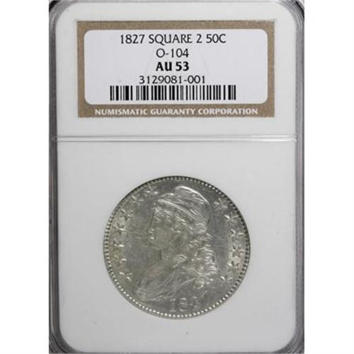 <B>1827 50C Square Base 2 AU53 NGC.</B></I> O-104. NGC Census: (105/1112). PCGS Population (98/702). Mintage: 5,493,400. Numismedia Wsl. Price for NGC/PCGS coin in AU53: $360. (#6144)<BR><BR><B>Coin Engraver:</B> John Reich<BR><BR><b>Shipping:</b> Coins & Currency (<a target="_blank" href="http://www.heritageauctions.com/common/shipping.php">view shipping information</a>)