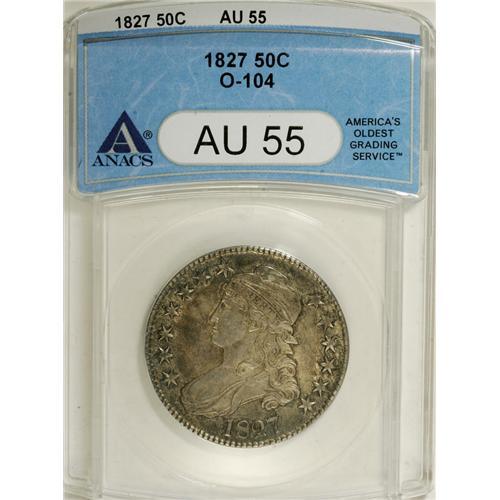 <B>1827 50C Square Base 2 AU55 ANACS.</B></I> O-104. NGC Census: (276/1324). PCGS Population (167/493). Mintage: 5,493,400. Numismedia Wsl. Price for NGC/PCGS coin in AU55: $300. (#6144)<BR><BR><b>Shipping:</b> Coins & Currency (<a target="_blank" href="http://www.heritageauctions.com/common/shipping.php">view shipping information</a>)