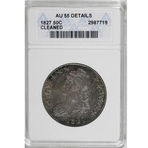 <B>1827 50C Square Base 2--Cleaned--ANACS. AU55 Details.</B></I> NGC Census: (145/902). PCGS Population (182/504). Mintage: 5,493,400. Numismedia Wsl. Price for NGC/PCGS coin in AU55: $300. (#6144)<BR><BR><B>Coin Engraver:</B> John Reich<BR><BR><b>Shipping:</b> Coins & Currency (<a target="_blank" href="http://www.heritageauctions.com/common/shipping.php">view shipping information</a>)