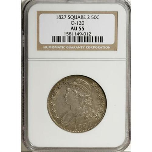 <B>1827 50C Square Base 2 AU55 NGC.</B></I> O-120a, R.3. Incorrectly designated as O-120 on the NGC insert. This charming Choice AU half has autumn-brown borders and dove-gray interiors. Luster shimmers from the borders and other design crevices.<BR><BR><B>Coin Engraver:</B> John Reich<BR><BR><b>Shipping:</b> Coins & Currency (<a target="_blank" href="http://www.heritageauctions.com/common/shipping.php">view shipping information</a>)
