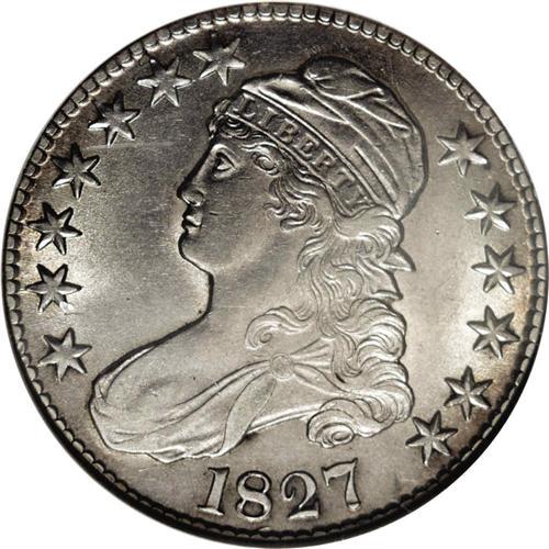 <B>1827<50C> Square Base 2 AU55 NGC.</B></I> O-136, R.4. This variety is distinctive because of the die lines in the field above the cap on the obverse. The reverse, however, has several distinguishing characteristics. Probably the most peculiar is the triple outline on the left side of the shield. Also, lines of stripe 6 extend below the eagle's feathers. The first of two high grade examples, this piece is notably sharp on the central details, but there is some softness noted on the peripheral stars, especially those on the left side. Generally untoned, there is a notable presence of mint luster surrounding the devices. Tied with three other coins at the AU55 level, according to Stephen Herrman, and as such a lower Condition Census example.<BR><I>Ex: Paul Padget (5/30/1989).</B></I> Envelope Included.